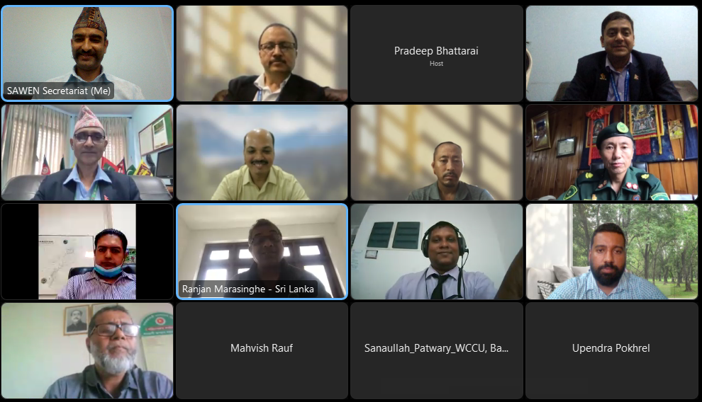 Virtually organized Ninth Executive Committee Meeting of SAWEN concluded with some important decisions in regard to strengthen the institutionalization process of SAWEN. The Meeting was commenced in the presence of Focal Persons and representatives from Bangladesh, Bhutan, India, Maldives, Nepal, Pakistan and Sri Lanka along with the Secretariat team. The Chief Enforcement Coordinator of SAWEN Dr. Ram Chandra Kandel chaired the Meeting.