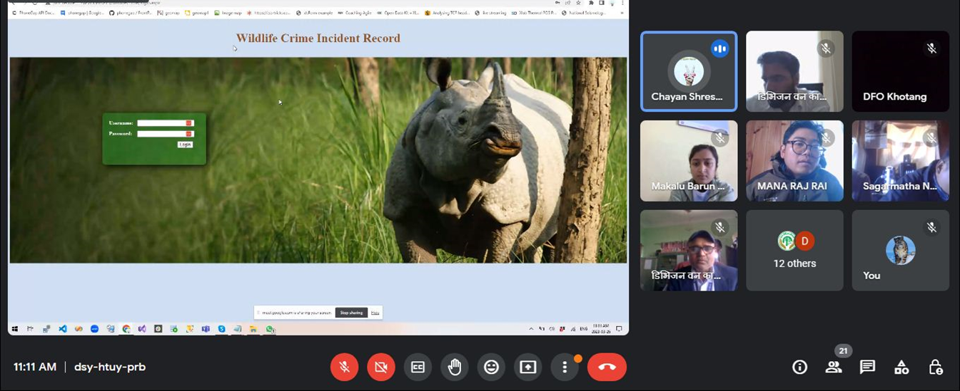Inaugurating the program, Mr. Ajay Karki, SAWEN Focal Person of Nepal and Deputy Director General, Department of National Parks and Wildlife Conservation (DNPWC) emphasized the importance and various applications of the System. Ms. Sabnam Pathak, officer at Department of Forests and Soil Conservation (DoFSC) encouraged the participants to learn about the System. Mr. Pradeep Bhattarai, Senior Environment Officer at the SAWEN Secretariat, shared the system's development process, initial stage implementation, resource utilization, and capacity development activities carried out so far. Mr. Bhattarai highlighted the features, data entry mechanisms and held a practical session about the system. Mr. Chayan Shrestha from Pathway Technology, the system developer, explained the technical aspects and features of the system. The System mainly covers wildlife crime, human wildlife conflict and wildlife rescue.