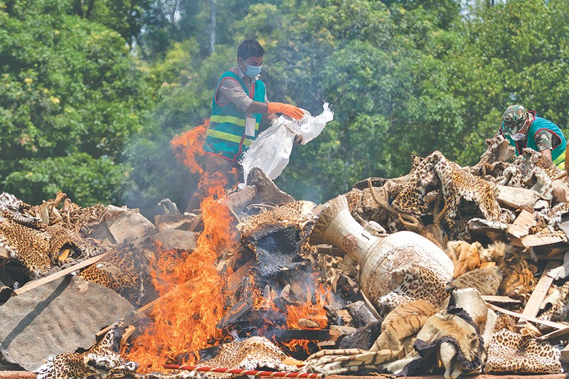 Nepal: Thousands of valuable animal skins and other parts, stored for about 20 years after they were seized from poachers, were destroyed on a huge pyre in the Chitwan National Park (CNP) on Monday, in a symbolic gesture of the country’s commitment against wildlife trade and poaching.