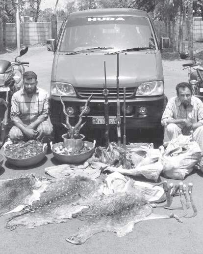 On Sunday morning, Abdul Majid (65) and Abdul Karim (45)were arrested when they were transporting skin, venison and antlers. The forest officials conducted raids on their shop and seized deer skin, antlers and venison.