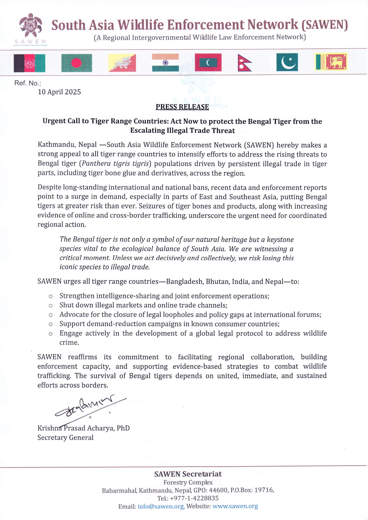 Kathmandu, Nepal —South Asia Wildlife Enforcement Network (SAWEN) hereby makes a strong appeal to all tiger range countries to intensify efforts to address the rising threats to Bengal tiger (Panthera tigris tigris) populations driven by persistent illegal trade in tiger parts, including tiger bone glue and derivatives, across the region.