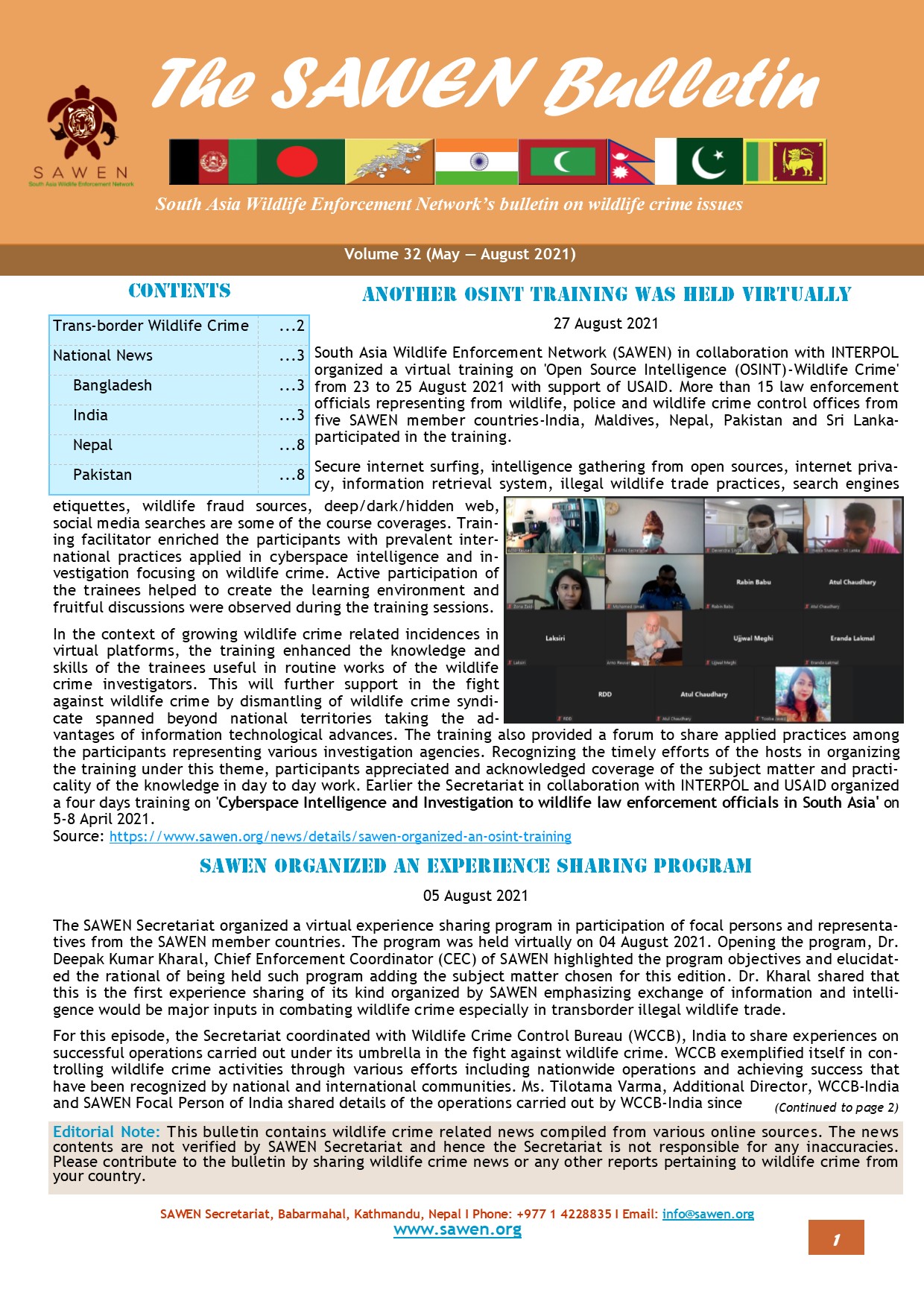 This bulletin contains SAWEN news and wildlife crime related news compiled from various online sources. The online sourced news contents are not verified by the SAWEN Secretariat and hence the Secretariat is not responsible for any inaccuracies. Please contribute to the bulletin by sharing wildlife crime news or any other reports pertaining to wildlife crime from your country.