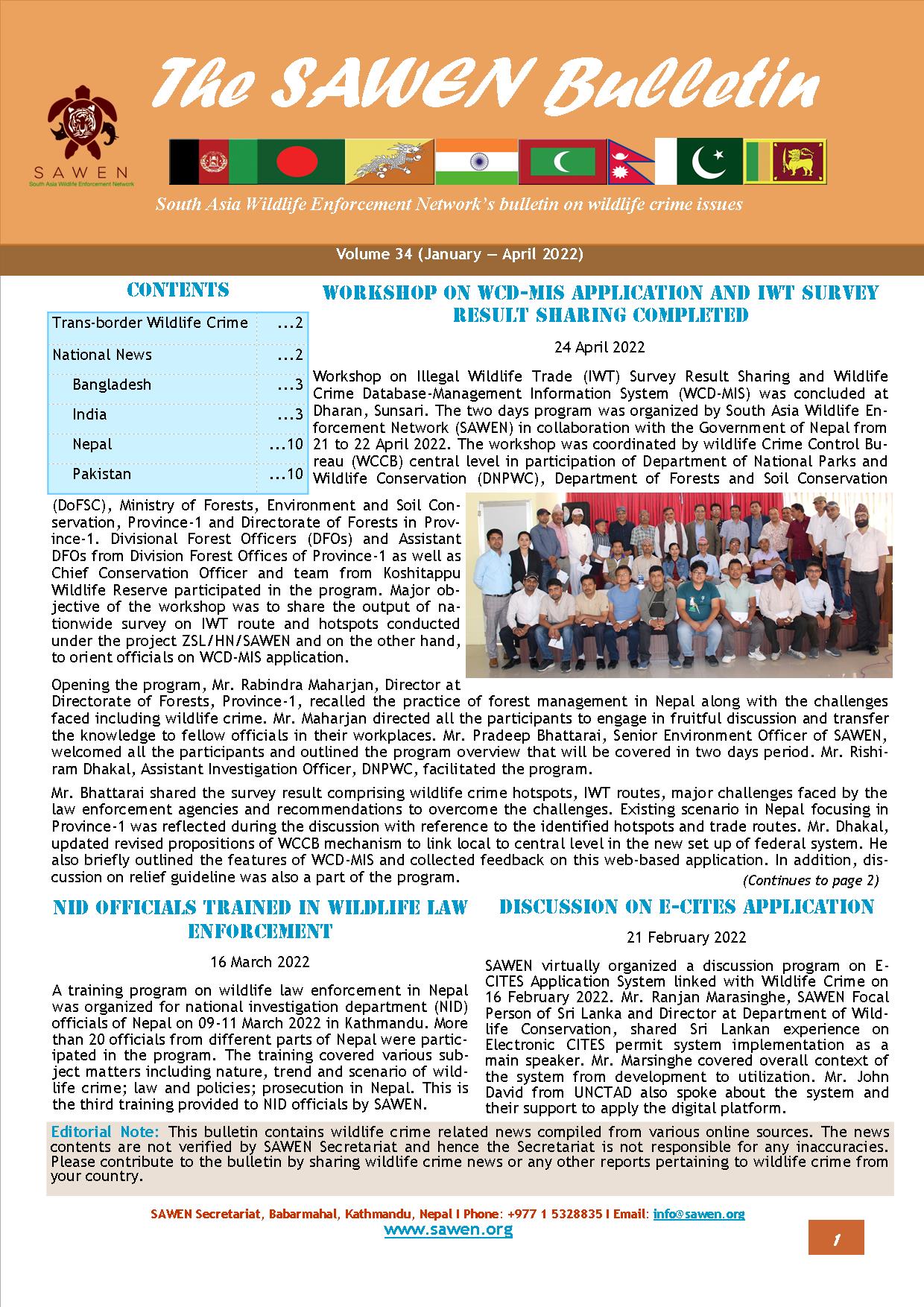 This bulletin contains SAWEN news and wildlife crime related news compiled from various online sources. The online sourced news contents are not verified by the SAWEN Secretariat and hence the Secretariat is not responsible for any inaccuracies. Please contribute to the bulletin by sharing wildlife crime news or any other reports pertaining to wildlife crime from your country.