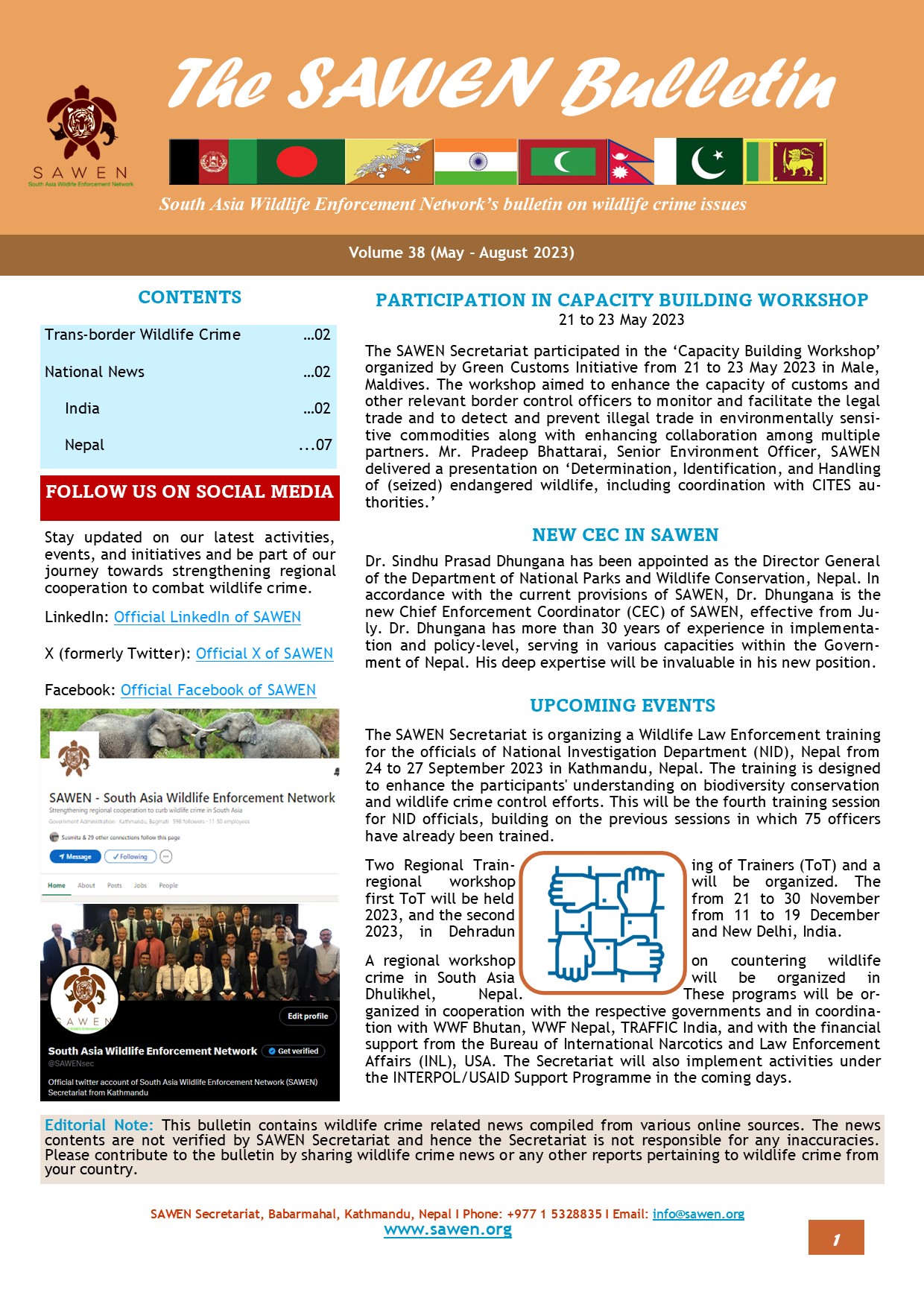 This bulletin contains SAWEN news and wildlife crime related news compiled from various online sources. The online sourced news contents are not verified by the SAWEN Secretariat and hence the Secretariat is not responsible for any inaccuracies. Please contribute to the bulletin by sharing wildlife crime news or any other reports pertaining to wildlife crime from your country.