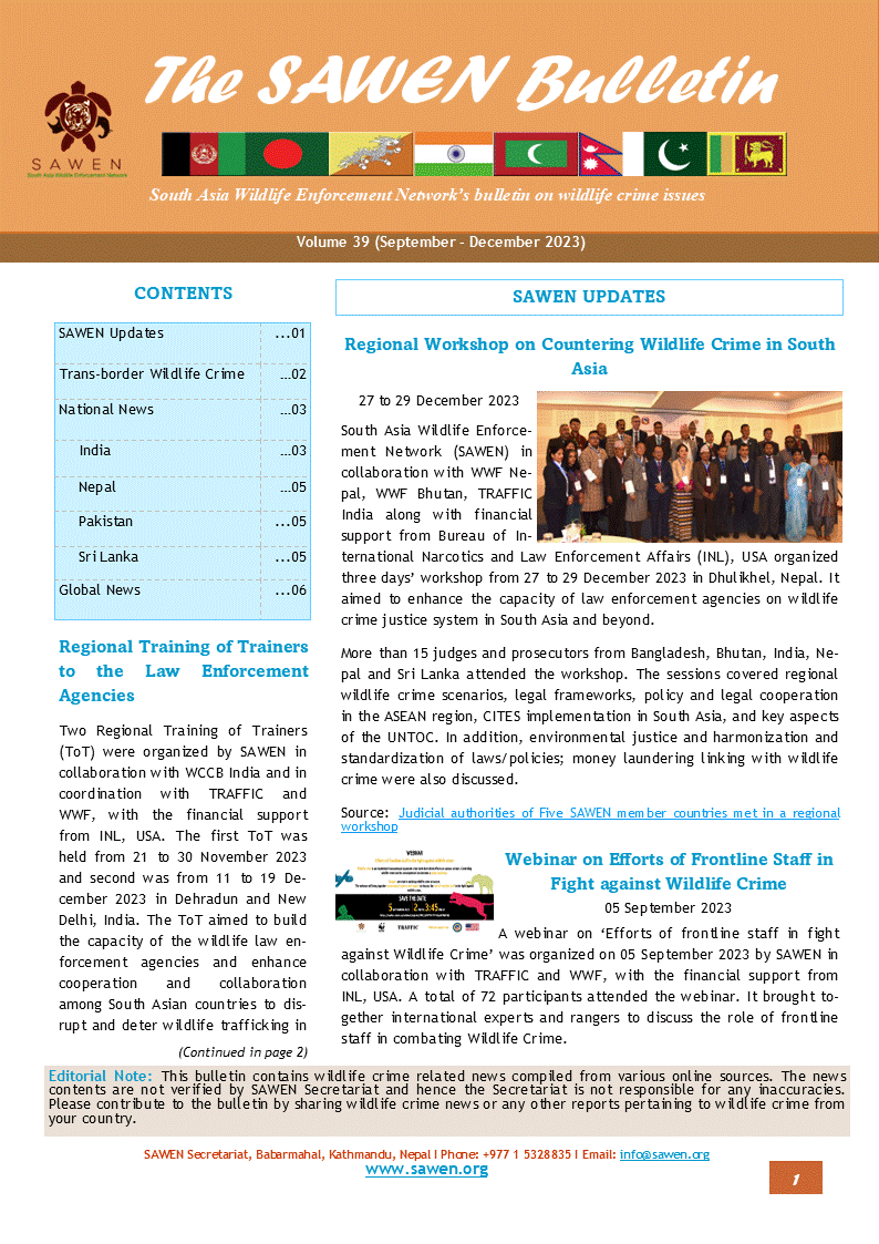 This bulletin contains SAWEN news and wildlife crime related news compiled from various online sources. The online sourced news contents are not verified by the SAWEN Secretariat and hence the Secretariat is not responsible for any inaccuracies. Please contribute to the bulletin by sharing wildlife crime news or any other reports pertaining to wildlife crime from your country.