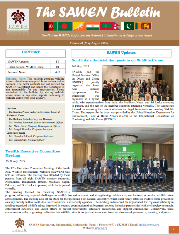 This bulletin contains wildlife crime-related news compiled from various online sources. The news contents are not verified by SAWEN Secretariat and hence the Secretariat is not responsible for any inaccuracies. Please contribute to the bulletin by sharing wildlife crime news or any other reports pertaining to wildlife crime from your country.