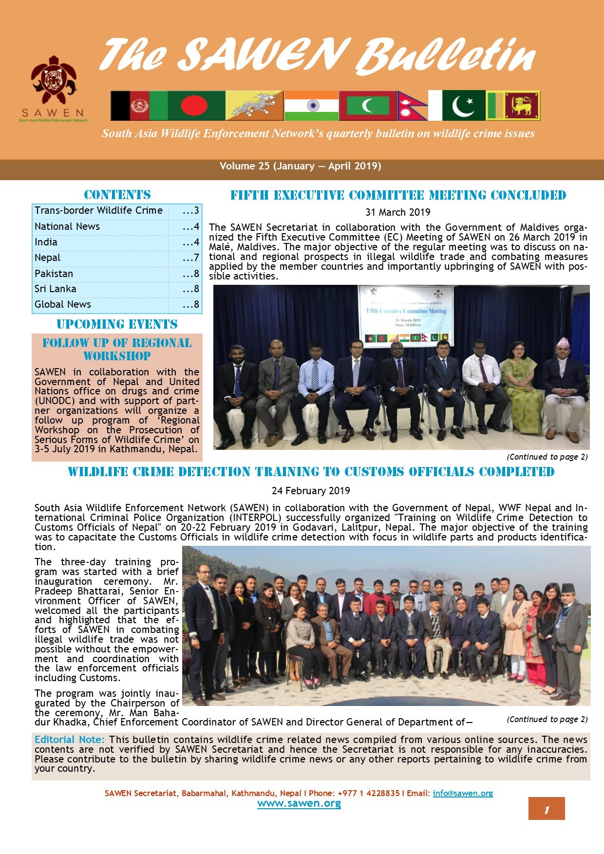 This bulletin contains wildlife crime related news compiled from various online sources. The news contents are not verified by the SAWEN Secretariat and hence the Secretariat is not responsible for any inaccuracies. Please contribute to the bulletin by sharing wildlife crime news or any other reports pertaining to wildlife crime from your country.